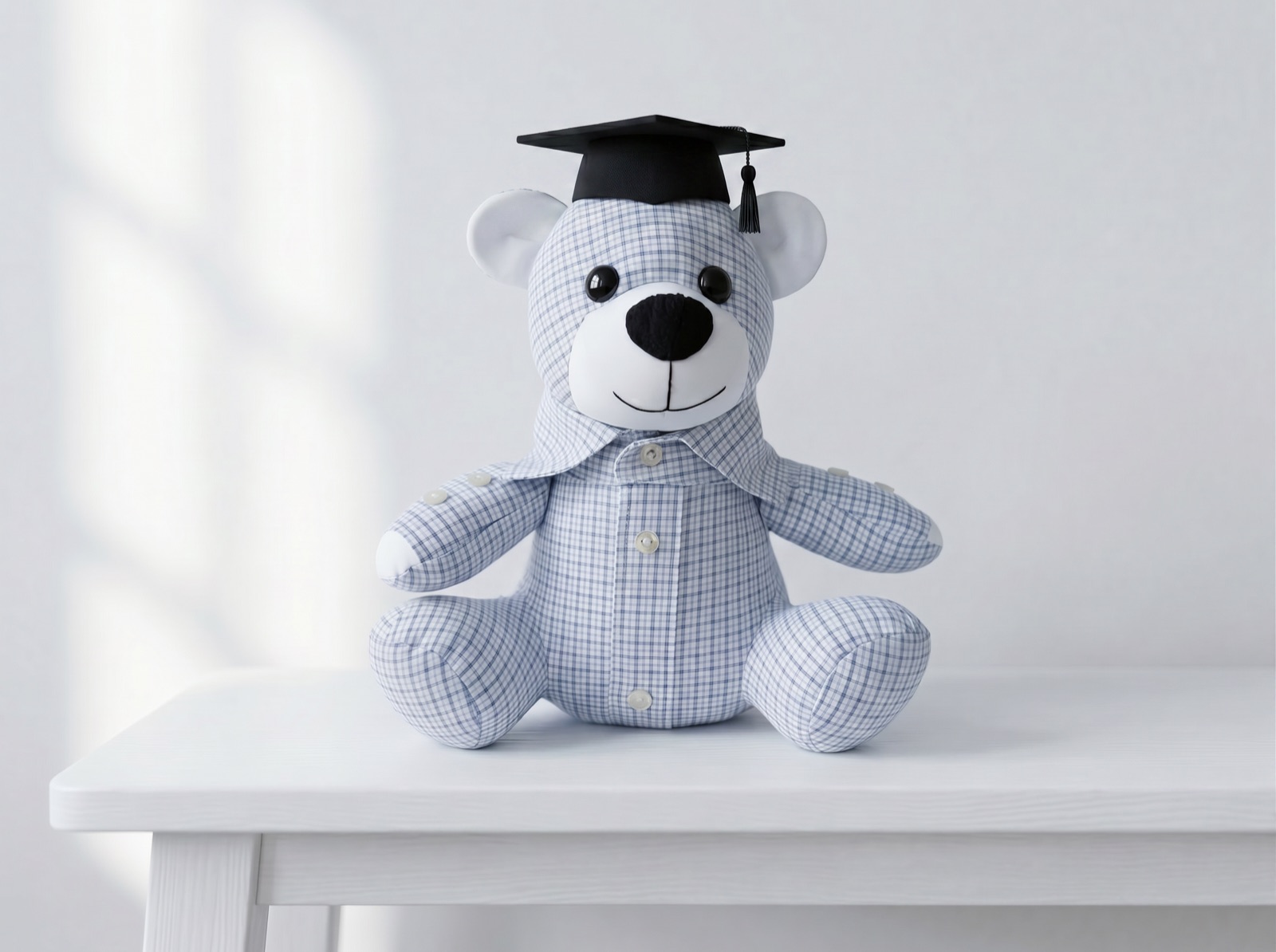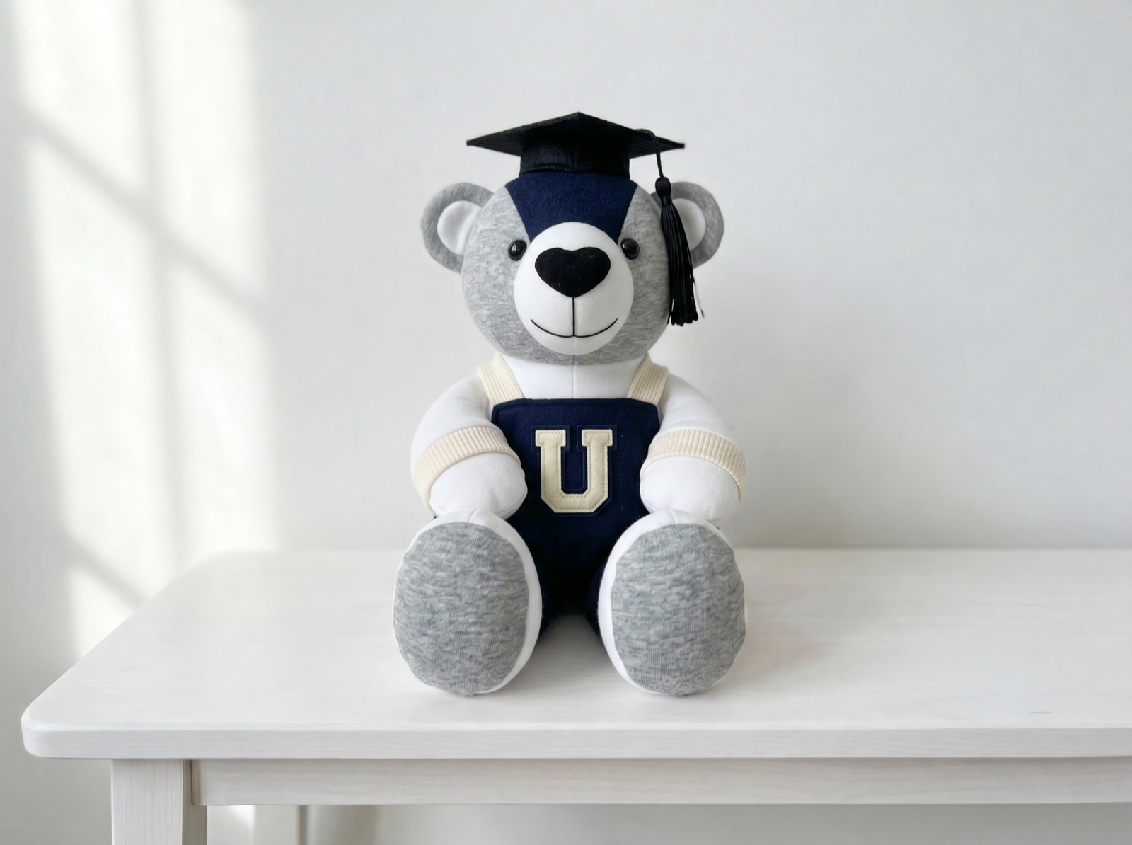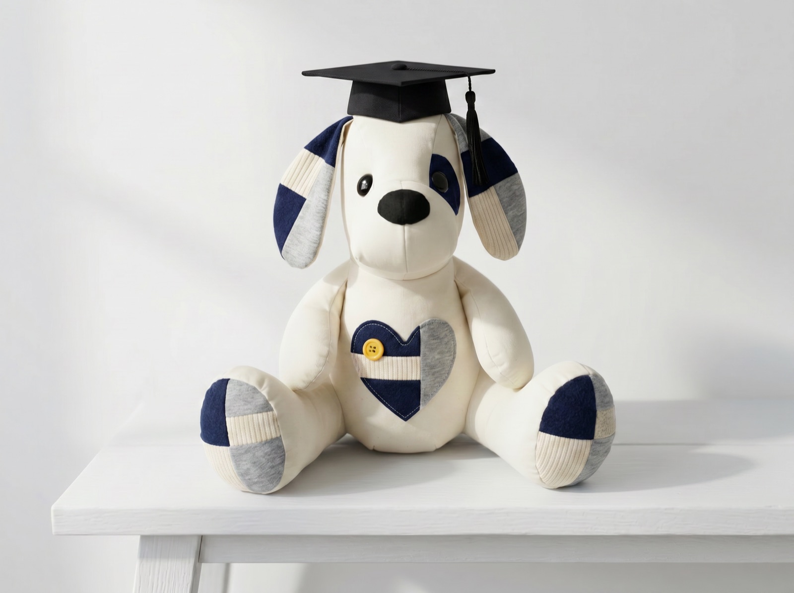 Stitched MemoryA handcrafted keepsake bear or pup, sewn from the senior-year t-shirts, letterman jacket, or favorite hoodie your graduate actually wore. For the graduate — or for the parent not quite ready for the house to feel that quiet.
